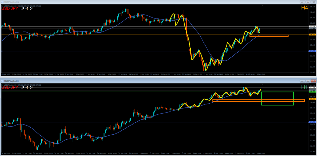 4時間足は高値を超えて上昇。そこから押しているエリア。