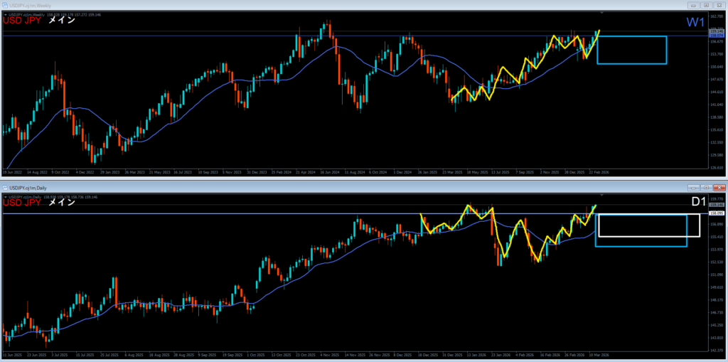 週足は高値を超えて上昇。上昇の波の途中。