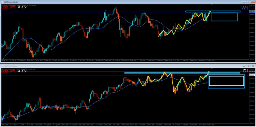 週足は高値を超えて上昇。上昇の波の途中。