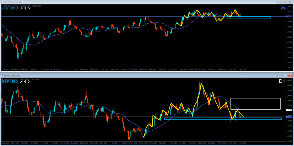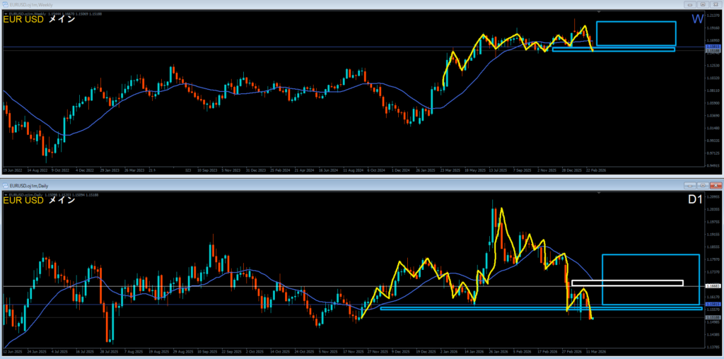 青色の週足レジサポートラインの下に押し目買い勢力、上に売り抑え勢力がいる。