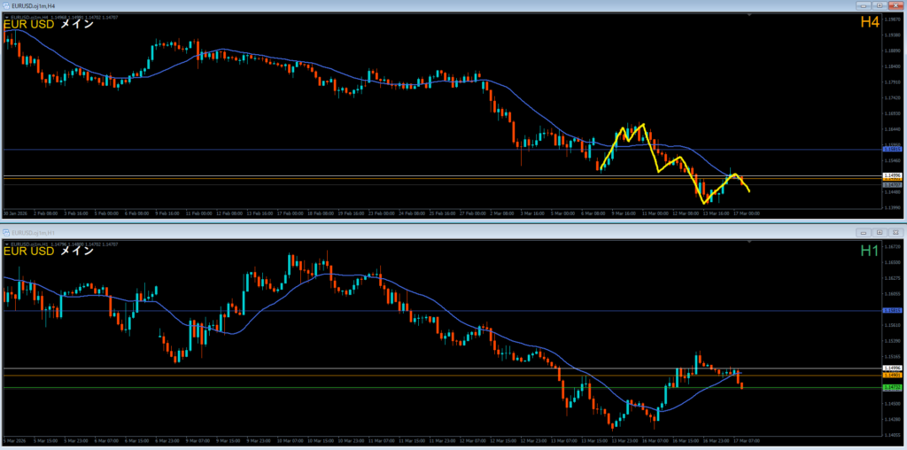 1時間足は安値を割って下落。そこから戻して下落の波の途中。