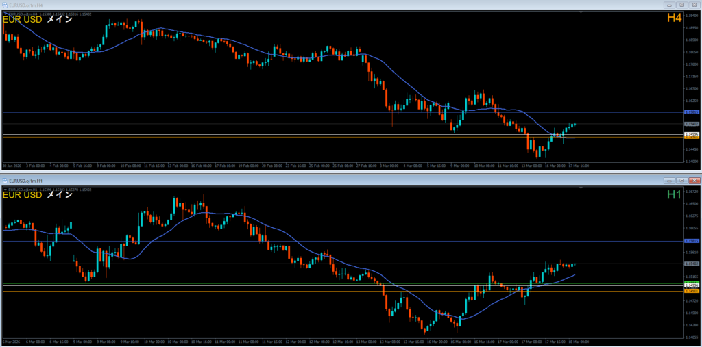 緑色の1時間足レジスタンスラインの上に戻り売り(そろそろ売り抑え)勢力がいる。