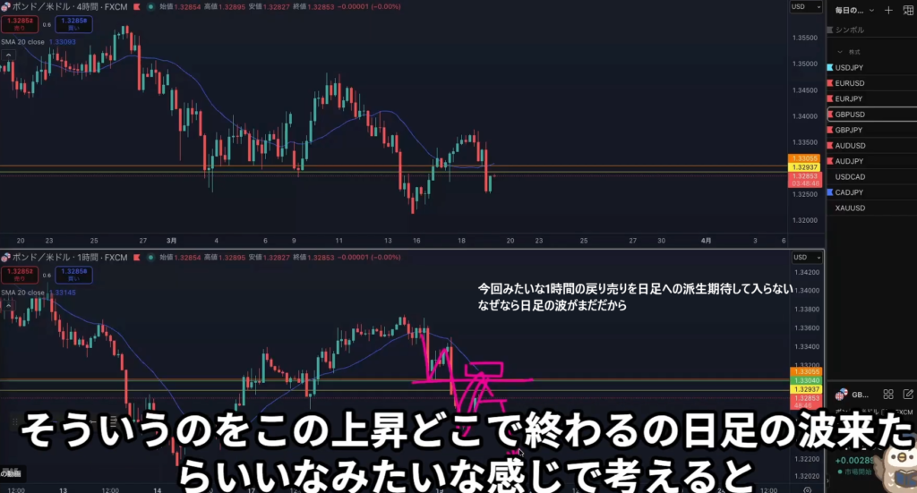 狙う波が4時間なのか日足なのかで、許容する下落の深さやエントリー時間足が変わる。