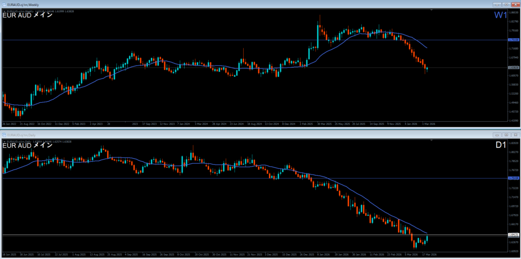 週足は安値を割って下落。下落の波の途中。