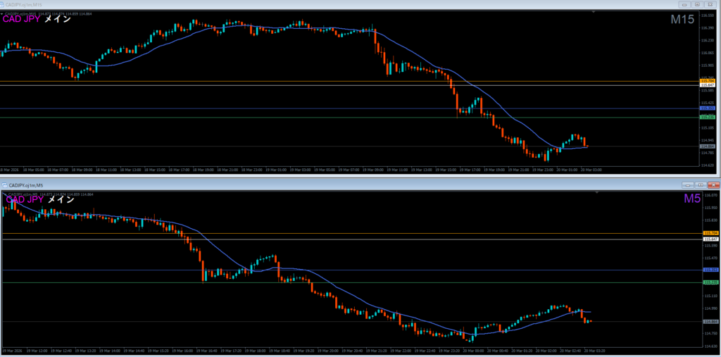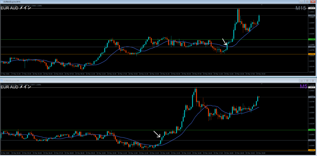 1時間エントリが逆から一気だが、1時間戻り売り否定の15分高値越え