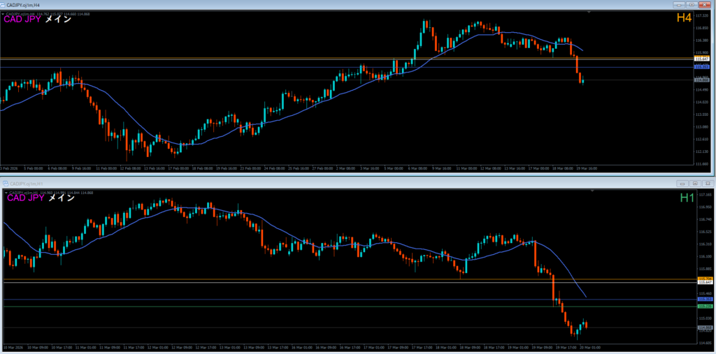 4時間足は安値を割って下落。下落の波の途中。