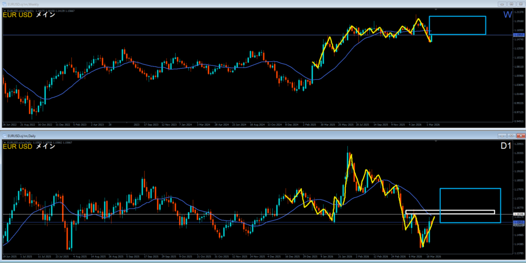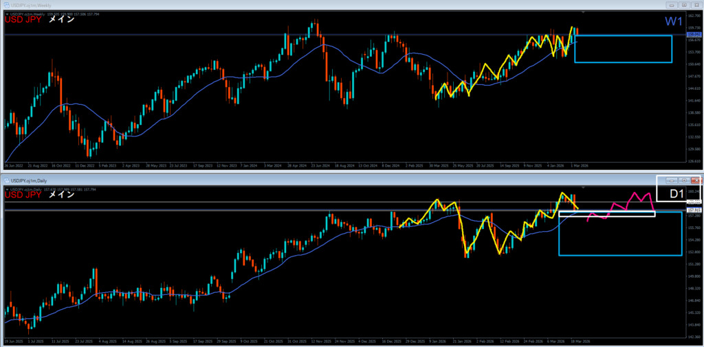 黄色、日足は高値を超えて上昇。押してきているエリア。