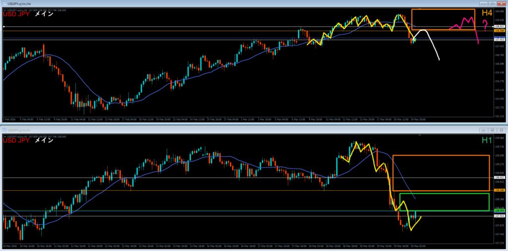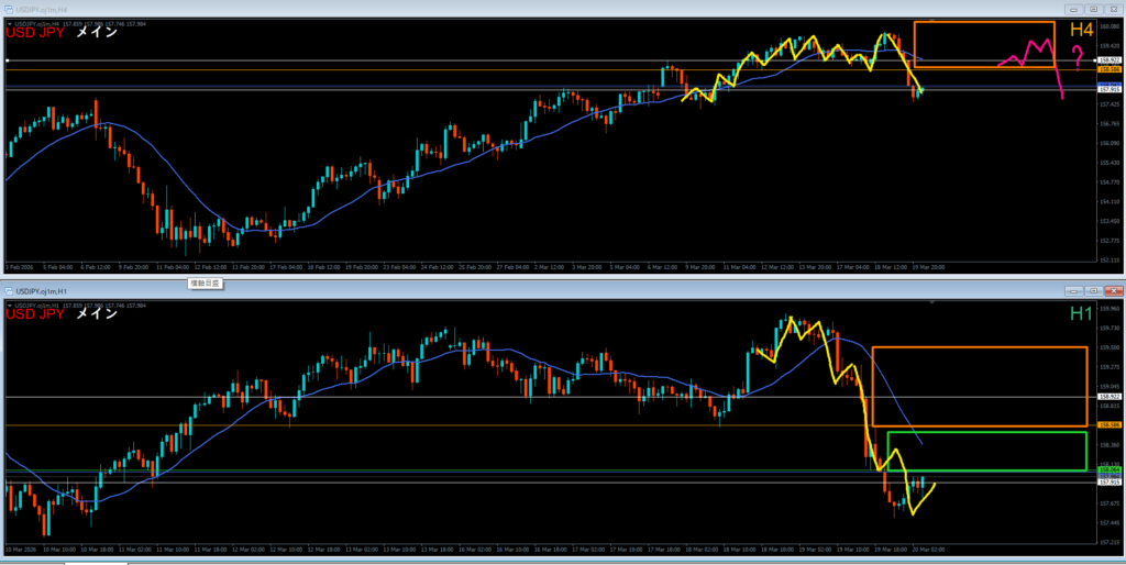 戻り売りはオレンジ色の4時間レジスタンスラインが機能していくか見ていく。来週かな?