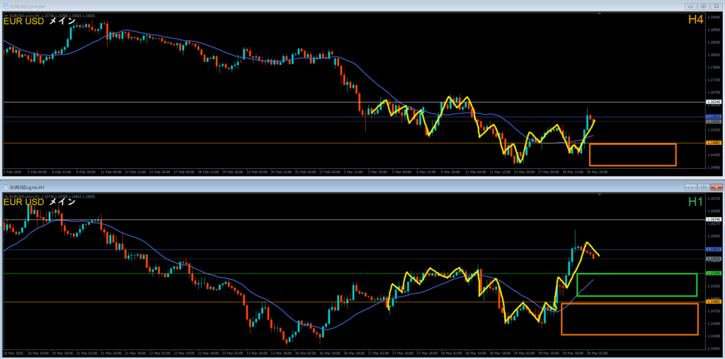 緑色の1時間足レジスタンスラインの上に戻り売り勢力がいる。