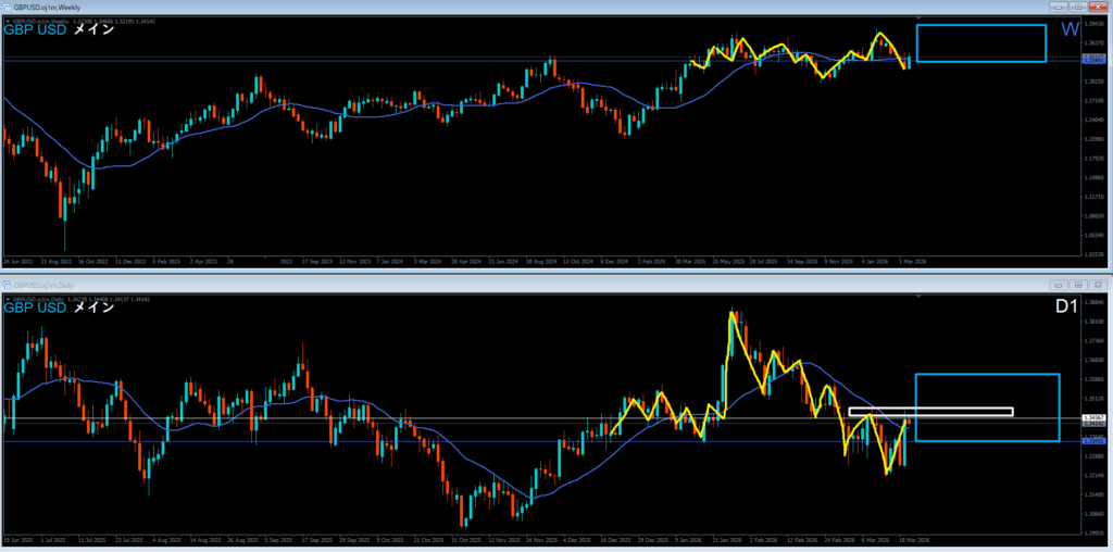 週足は高値を超えて上昇。上昇の波の途中。