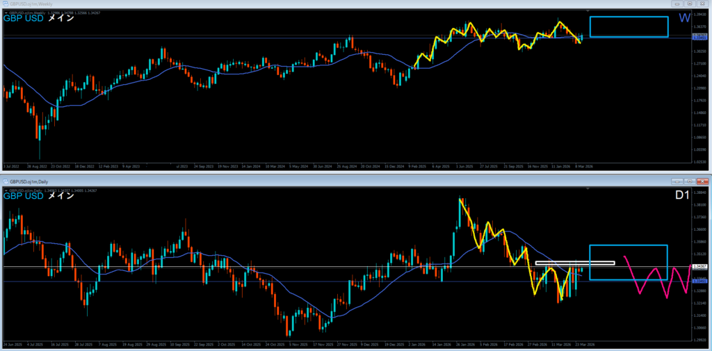 週足は高値を超えて上昇。上昇の波の途中。