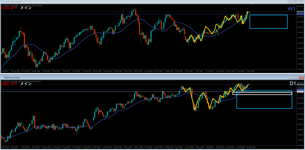青色の週足レジサポートラインの下に押し目買い勢力がいる。