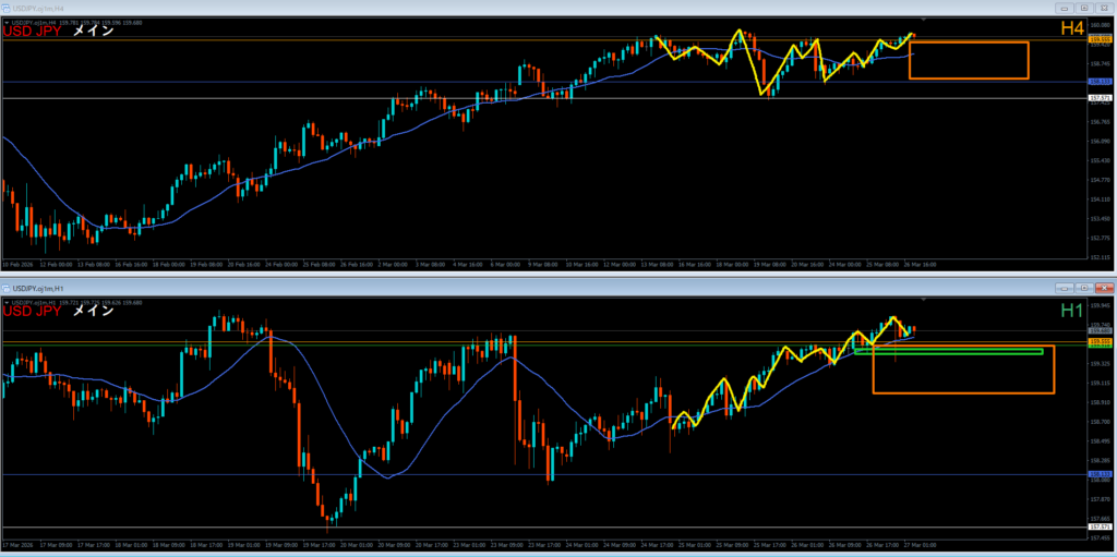 緑色の1時間足サポートラインの下に押し目買い勢力がいる。