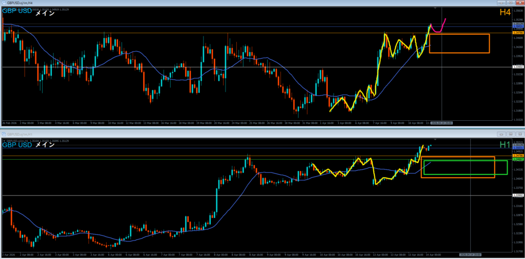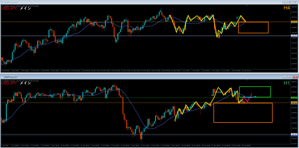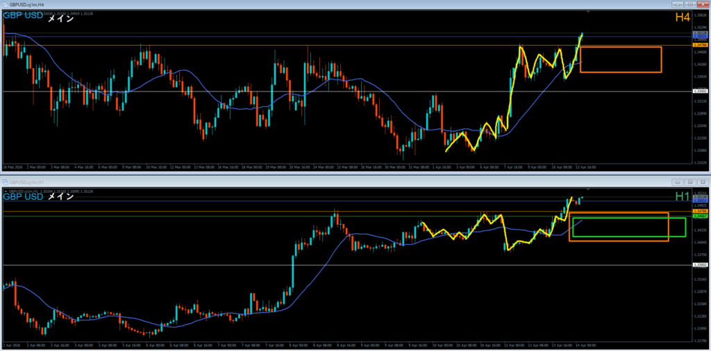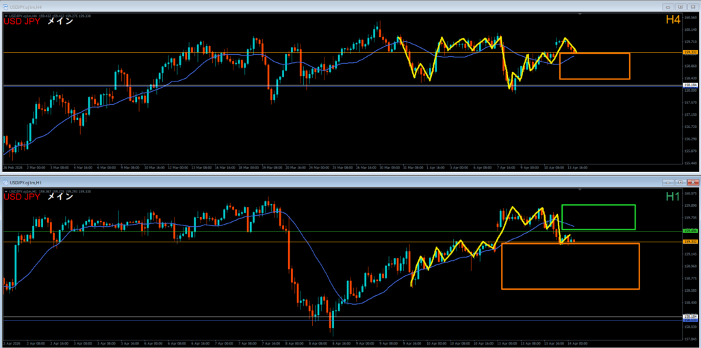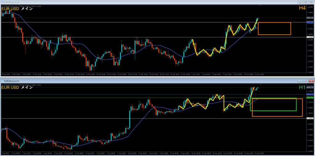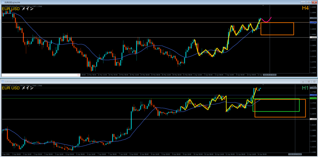 4時間足は高値を超えて上昇。そこから押して確認しているエリア。
