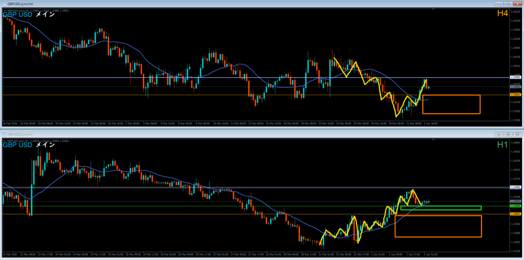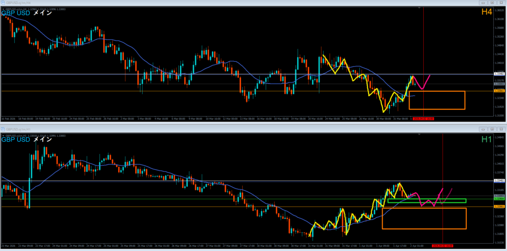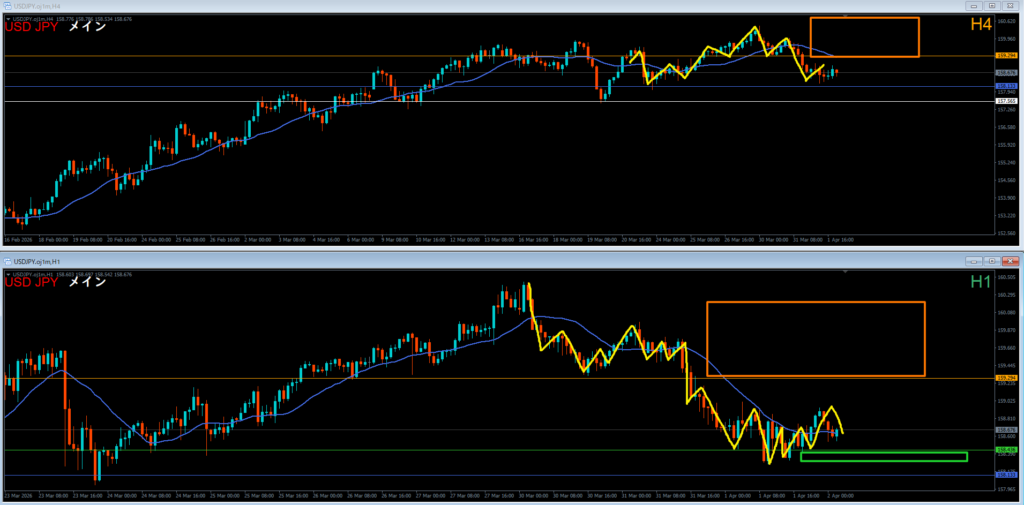 戻り売りはオレンジ色の4時間レジスタンスラインが機能していくか見ていく。
