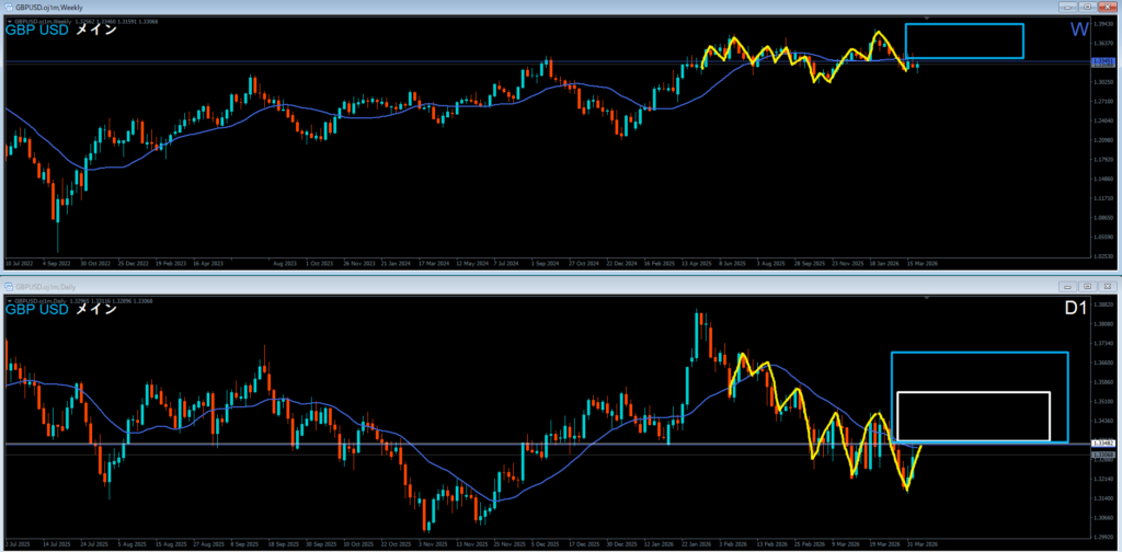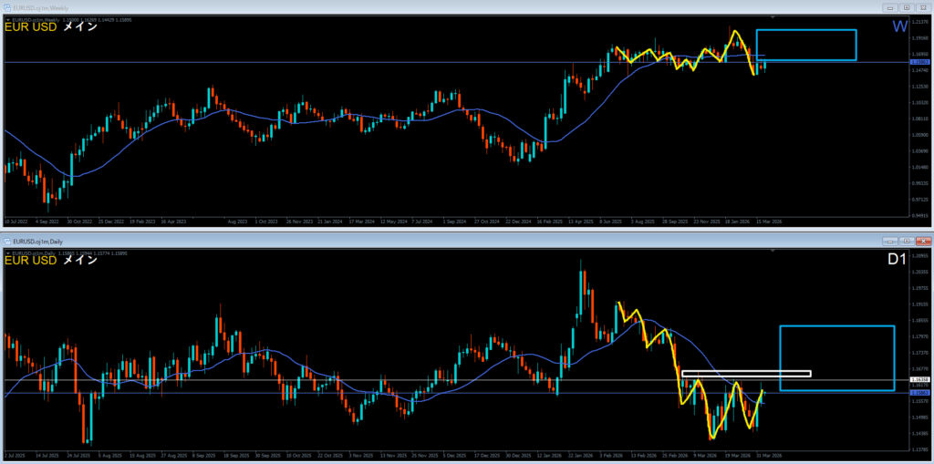 週足は高値を超えて上昇。上昇の波の途中。