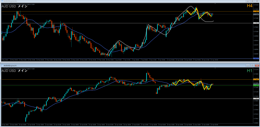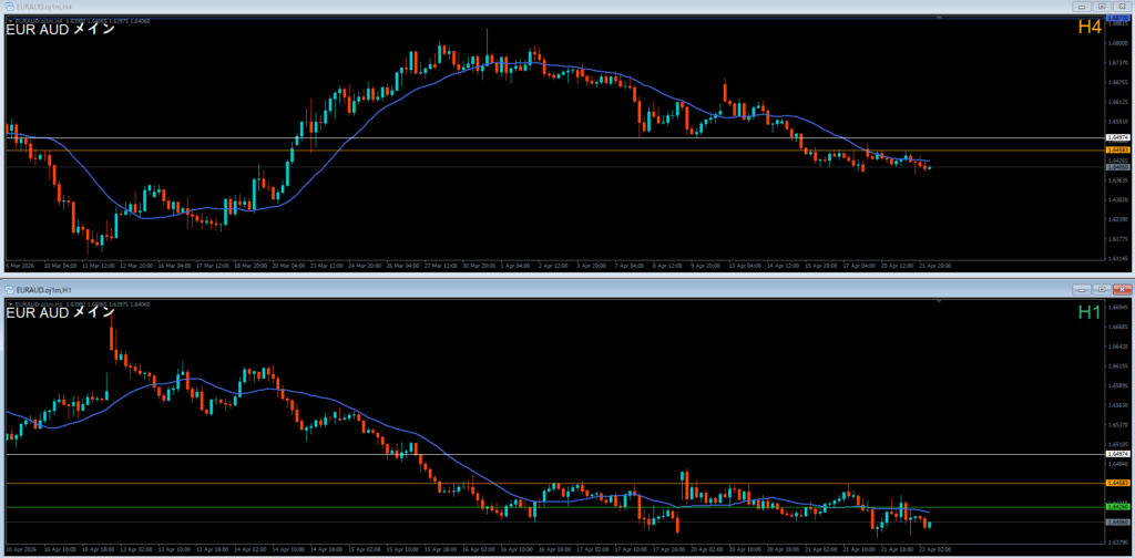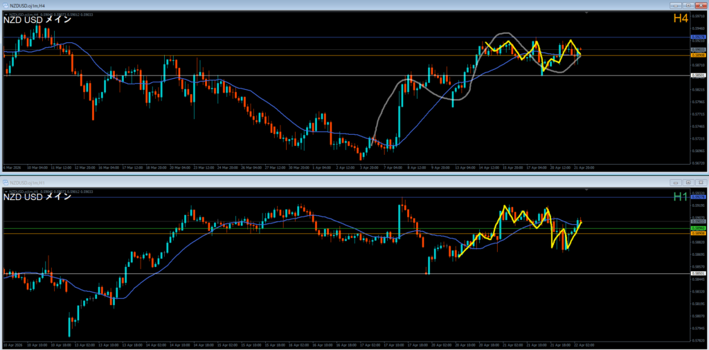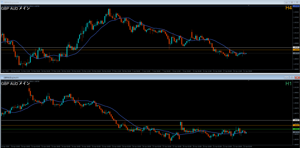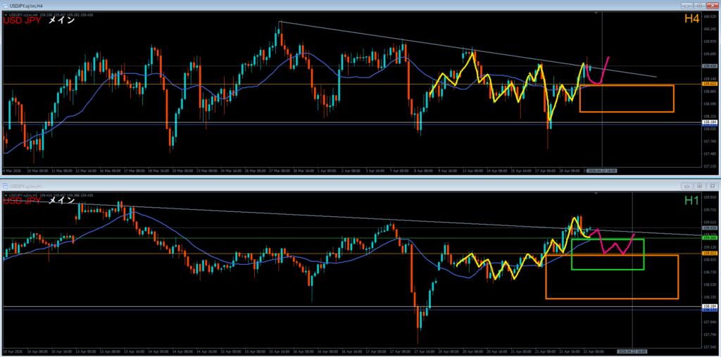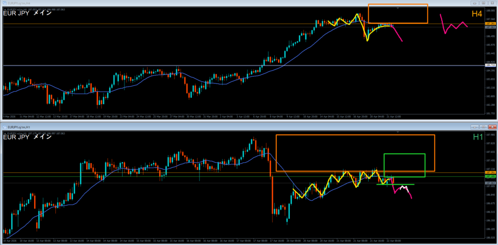 4時間足は安値を割って下落。そこから戻して確認しているエリア。