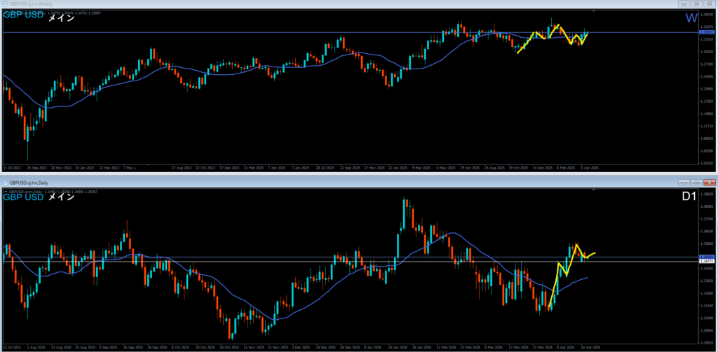 週足戻り売り勢力に抑えられている中、週足と日足がぶつかっている感じ。