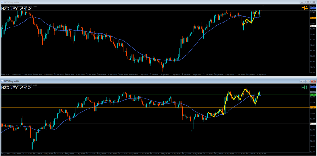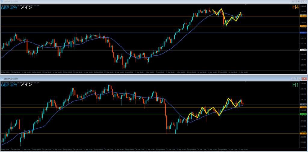 現状日足の押し目買い勢力に4時間足で2回確認しているっぽい感じ。
