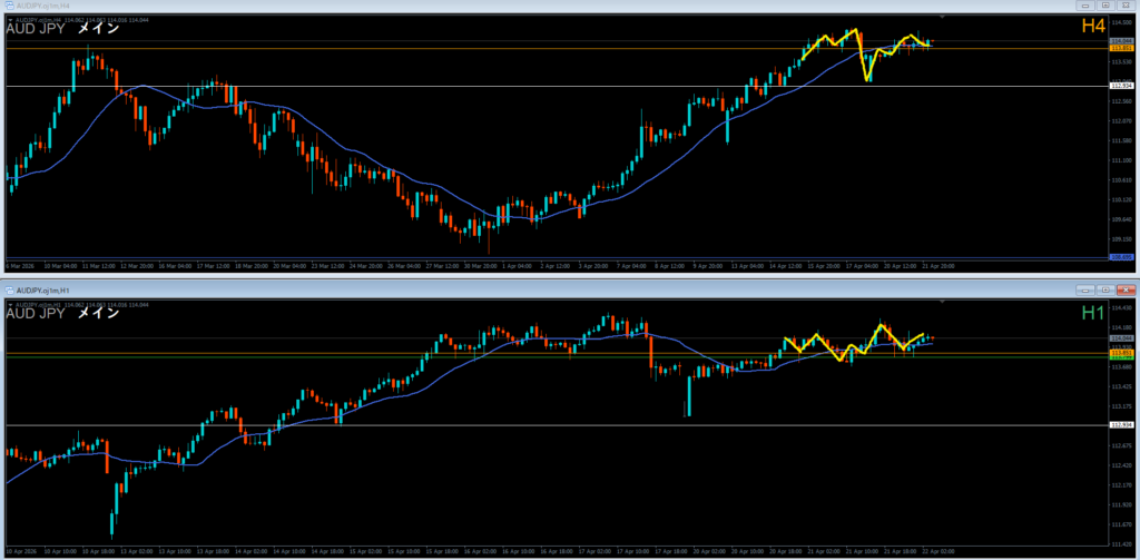 1時間足は高値を超えて上昇。そこから押して確認しているエリア。