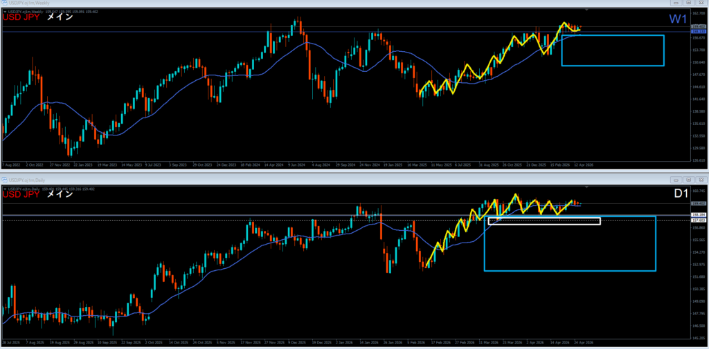 日足は高値を超えて上昇。そこから押してきて確認しているエリア or 上昇波の根っこ。