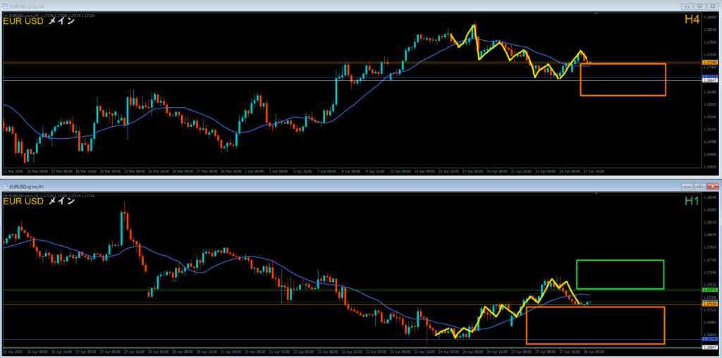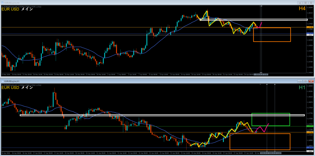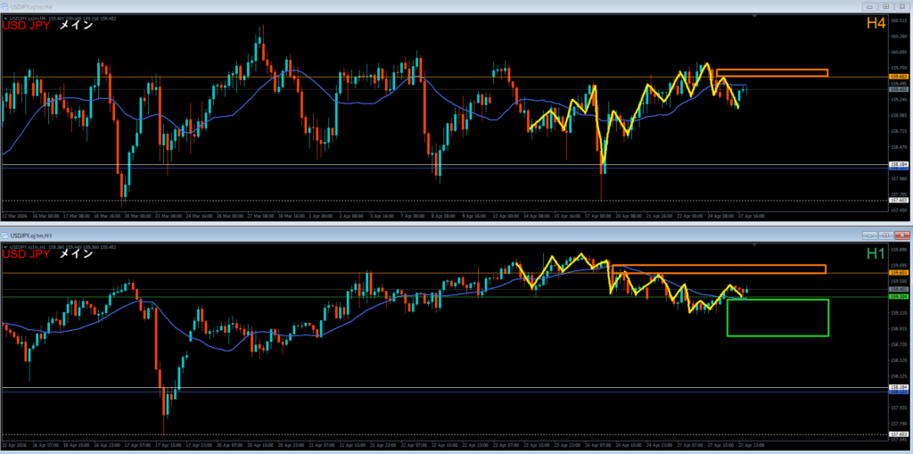 4時間足は安値を割って下落。そこから戻して確認しているエリア。