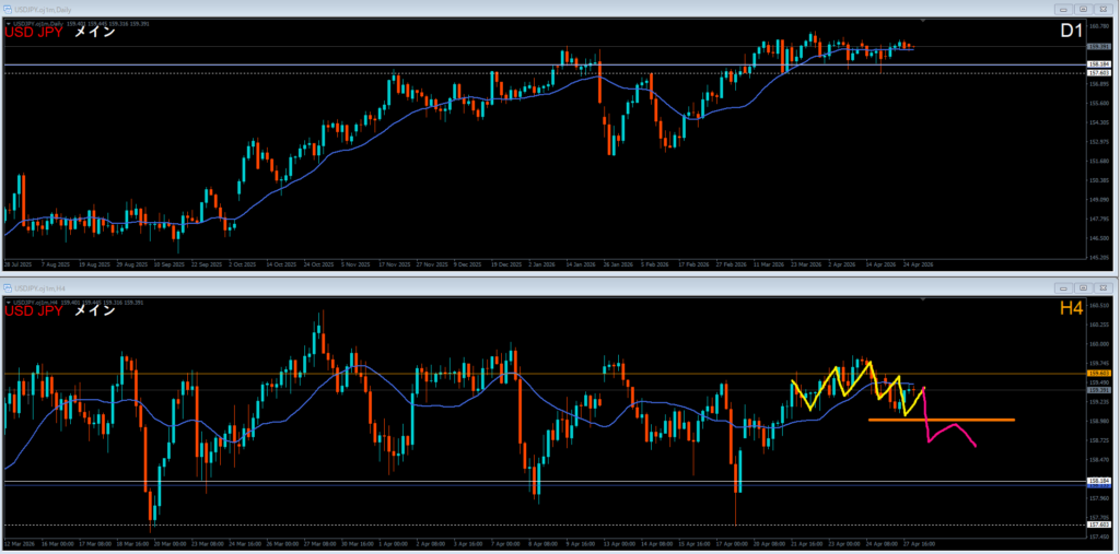 4時間足は安値を割って下落。下落波の途中。